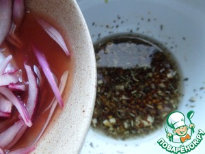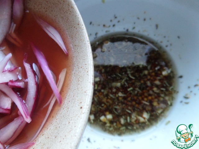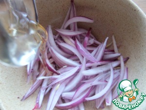 Вначале нужно замариновать в уксусе красный лук минут на 5-10. Нарезать его полукольцами.