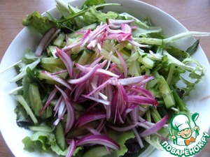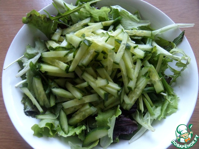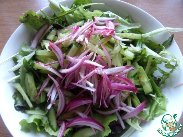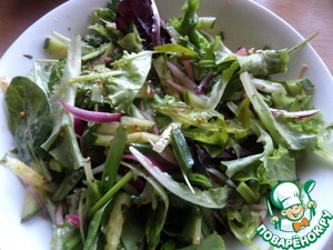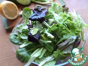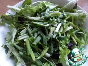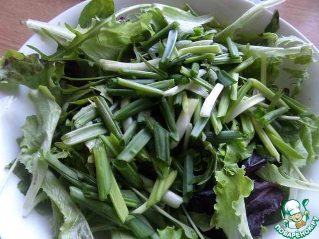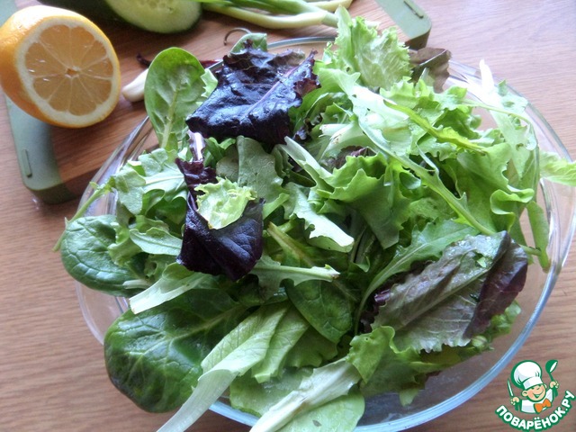 Салатный микс у меня итальянский, в нём такие листики: шпинат, рукола,lollo rosso,lollo biondo. Можно воспользоваться другими видами салатов.
