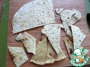 Чипсы делаем так: лаваш или, как у меня, кукурузная лепёшка. Подсушить в духовке или на сухой сковороде. Нарезать или поломать на кусочки.