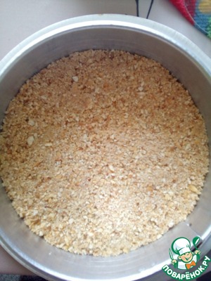 Берем съемную форму 22 см и ставим ее в плоскую тарелку. Наше печенье высыпаем и утрамбовываем.