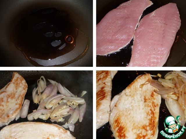 В сковороде нагреть оливковое масло. Положить грудки и обжарить с одной стороны 5- 7 минут. Перевернуть, добавить лук и чеснок и жарить еще 5- 7 минут.