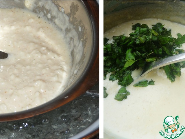 Параллельно готовим соус. Вскипятить воду в небольшой кастрюле. В миске растереть фету с молоком, добавить пропущенные через пресс зубчики чеснока, красный острый перец и мускат.