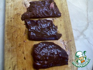Положить кусок печени в полиэтиленовый пакет и отбить с двух сторон. Так сделать с каждым куском.