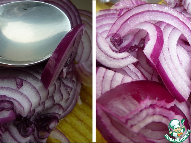 Лук нарезать полукольцами, влить лимонный сок, перемешать и оставить на 5мин.