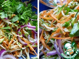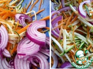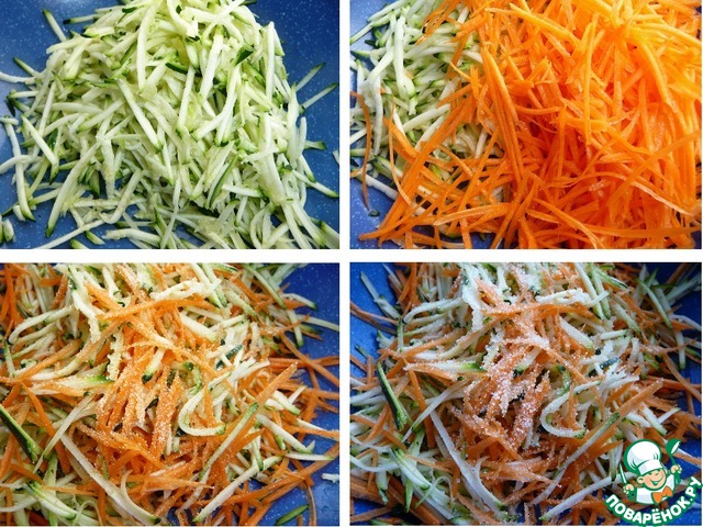 Цуккини и морковь натереть на китайской терке, немного посолить, добавить щепотку сахара, аккуратно перемешать.