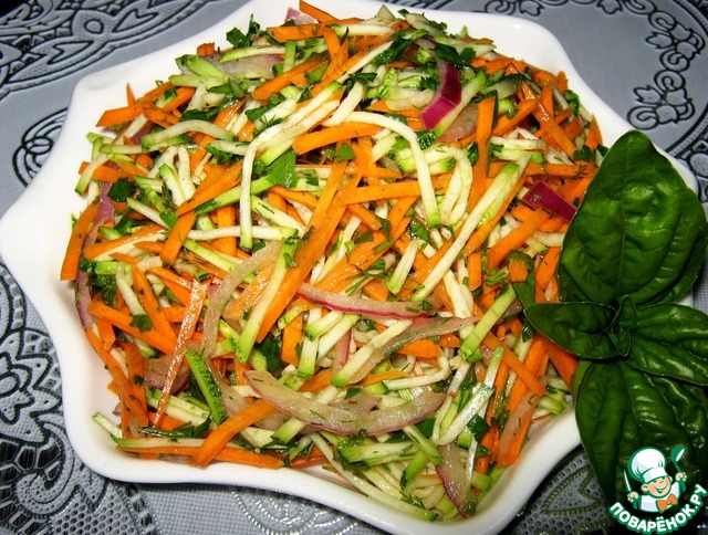 Предлагаю простой, сочный, весенний салат из цуккини, молодой моркови с красным луком и зеленью. Готовится очень быстро и порадует вас своим вкусом. Салат можно подавать к мясу или рыбе.