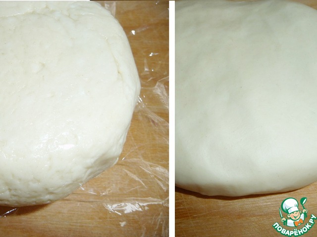 Замесить тесто вилкой. Скатать в шар руками. Затем на столе хорошо вымесить минут 5, чтобы масло распределилость равномерно. Тесто получается гладким. Упаковать в пищевую пленку и оставить при комнатной температуре на 30минут.