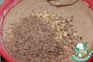 Нарубить арахис. Натираем шоколад на крупной терке. Взбиваем с сахаром яйца. Добавляем сливки, размягченное сливочное масло, соду и перемешиваем.