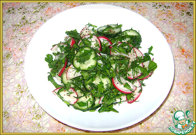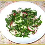 Предлагаю витаминный салат из зелени, редиса и огурца. Зелень взяла, что выросло в "огороде" на подоконнике (базилик, петрушка, культивированная черемша-дикий чеснок, зеленая руккола, чабер). Салат без чеснока, чтобы он не перебивал вкус зелени. Прекрасное дополнение к отварному куриному мясу.