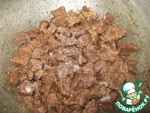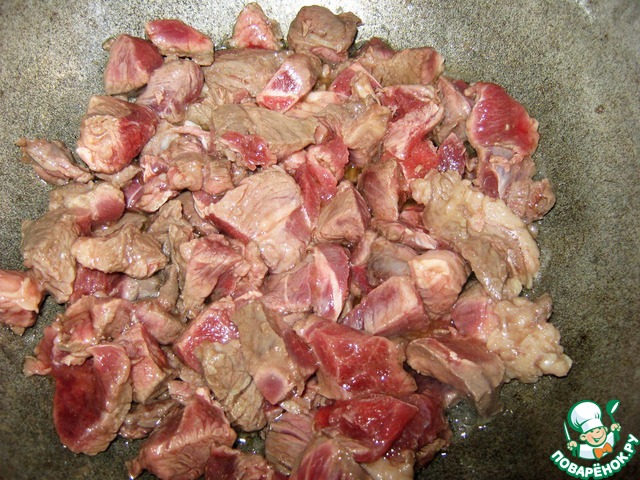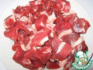 Мясо нарезать небольшими кусочками. (Можно использовать свинину).