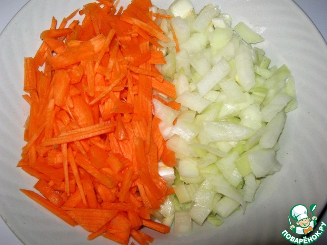 Почистить, помыть лук и морковь. Морковь 2/3 части мелко нашинковать, лук нарезать небольшими брусочками.