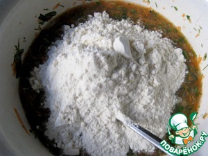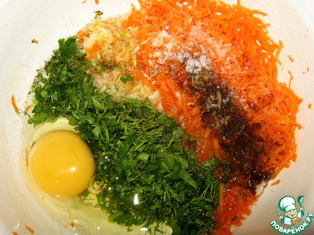 Для "Подушечек" в миску на мелкой тёрке натереть чеснок, морковь 1/3 часть, мелко порубить зелень. Вбить яйцо, добавить воду (100мл.), чайную ложку соли и перец черный. Перемешать.