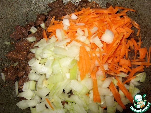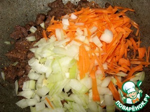 Лук и морковь обжарить с мясом.