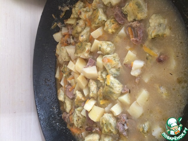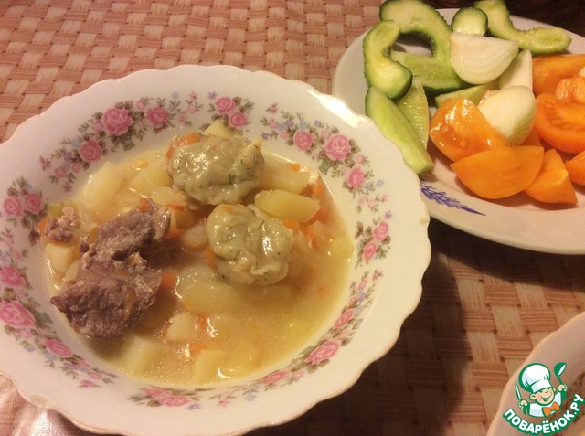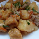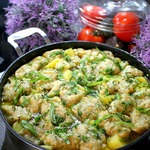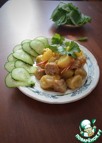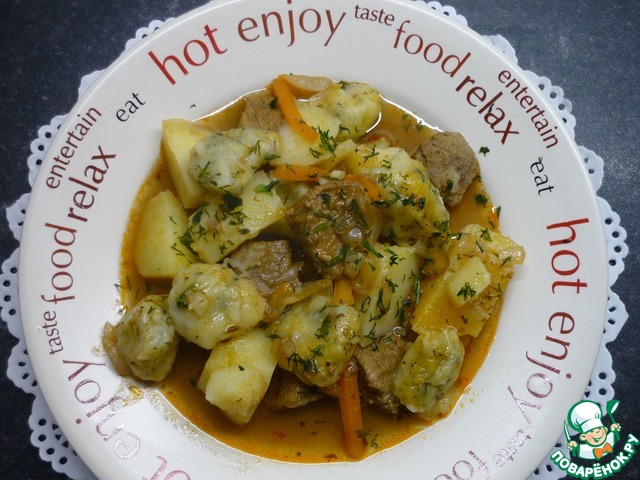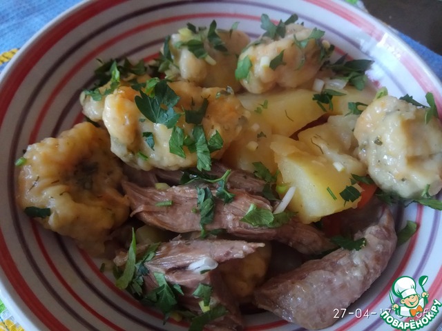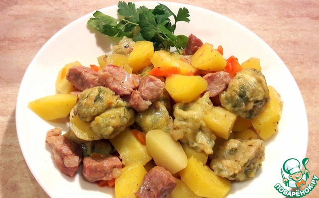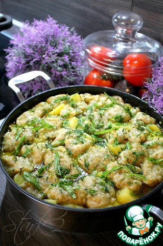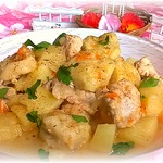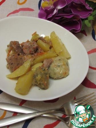Вкусный, ароматный, полноценный обед или ужин. Нежное мясо, мягкая картошечка и ароматные "подушечки". Готовить несложно, из самых доступных продуктов. Люблю вкусно и сытно накормить свою семью...