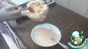 Форму для запекания застелить бумагой для выпечки. Приготовленным соусом надо обмазать нашу капусточку. Я начинаю со стороны стебля и стараюсь, чтобы как можно больше соуса попало вовнутрь.