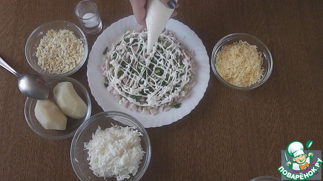 С той же целью, картофель натереть на крупной терке прямо на салат. Тогда блюдо получится очень нежным и воздушным. Нанести сеточку майонезом.