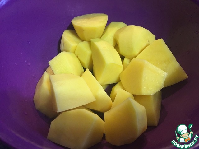 Отчищаем картофель, нарезаем на дольки и ставим отвариваться до готовности.