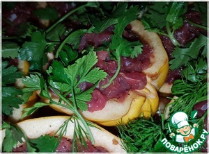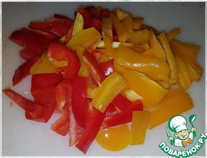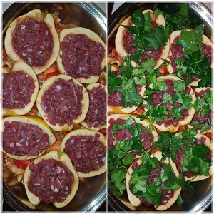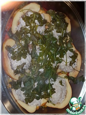 Перец болгарский, также равномерно и уже поверх всего этого айвовые чашки с фаршем. Фарш набивайте, именно набивайте в айву. Чем плотнее – тем лучше.