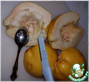 Айву режем пополам и тщательно удаляем сердцевину и семечки. Не знаю, правду ли говорят, но вроде как они, семечки, практически ядовитые.