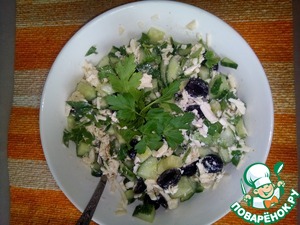 Соединяем ингредиенты, чеснок пропускаем через пресс, солим, перчим, заправляем оливковым маслом и посыпаем зеленью петрушки. Салат готов!