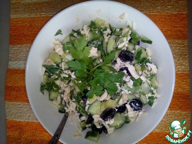 Уважаемые поварята предлагаю очень простой и вкусный салат. Рецепт вычитала в одном журнале и решила приготовить и поделиться с вами.