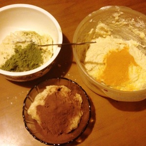 Тесто разделить на три равные части. В первую добавить куркуму, во вторую - чай матча, в третью - какао-порошок. Перемешать каждую часть в отдельности.