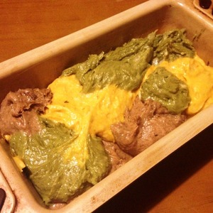 Форму для кекса смазать маслом. Выкладывать тесто разных цветов по 1 ст л в форму в произвольном порядке. Поставить в разогретую духовку.
