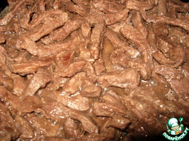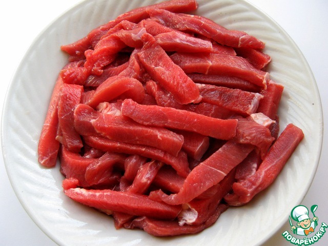 Мясо нарезать против волокон тонкими длинными ломтиками.