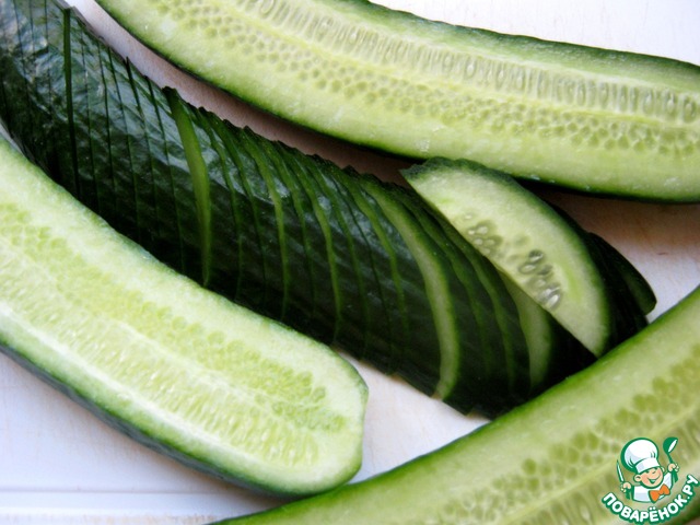 Огурец помыть. Разрезать вдоль пополам. Каждую половинку нарезать тонкими ломтиками наискось.