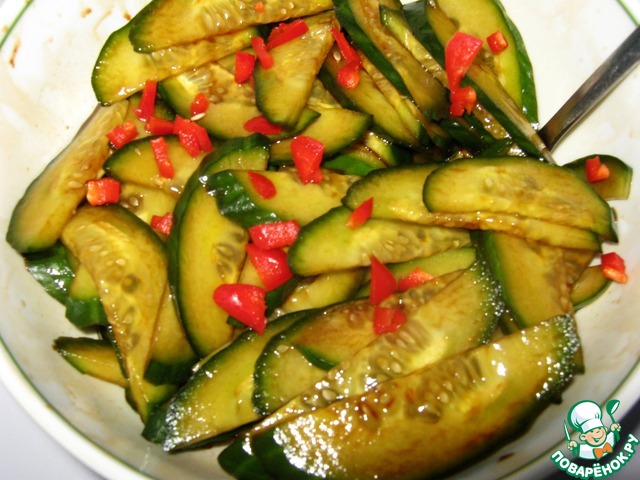 И замариновать огурцы в соевом соусе и уксусе, перемешать несколько раз. Добавить красный перец, мелко рубленный. Остроту подбирайте для себя индивидуально. Перец мне попался не очень горький.