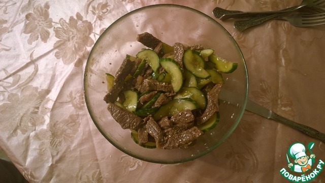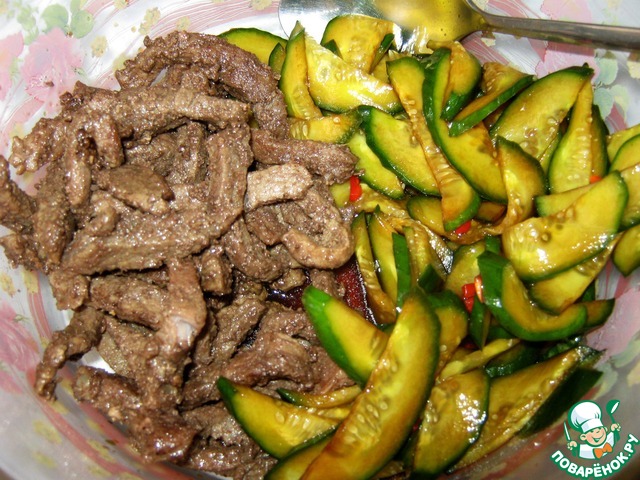 Собираем блюдо: Мясо перемешать с огурцами и маринадом.