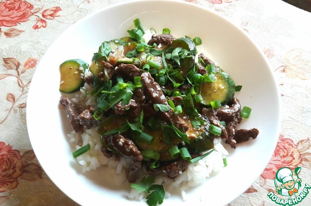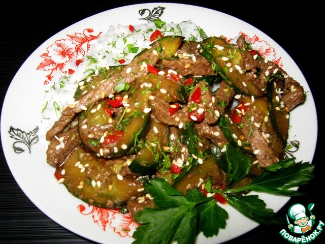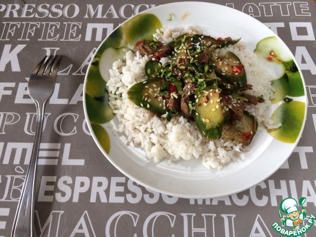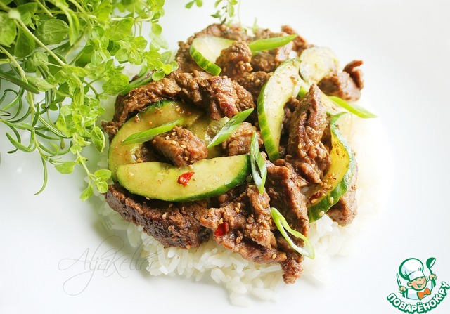 На тарелочку выложить рис, затем мясо с огурцами, сверху полить соусом-маринадом, посыпать кунжутом, красным перцем и зеленью. Время приготовления указано без учета времени на тушение мяса.