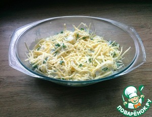 В форму для запекания, смазанную маслом, уклалываем картофель, заливаем соусом и посылаем тертым сыром.