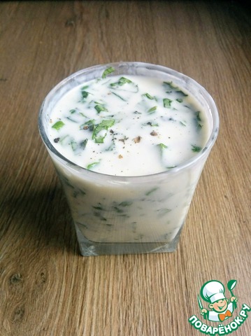 Приготовим соус. Йогурт смешиваем с порезанным базиликом, чесноком, солью, перцем по вкусу.