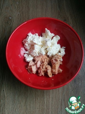 Тунец в собственном соку разминаем вилкой с фетой