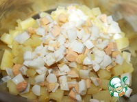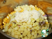 Яблоки очистить от кожуры и нарезать в последнюю очередь, чтобы они не успели потемнеть. Добавить майонез, его я использую всегда по минимуму. По вашему вкусу можно количество немного увеличить. |