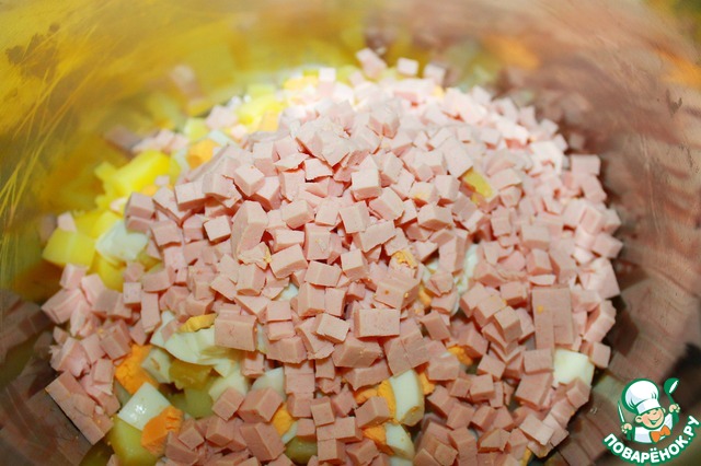 Колбасу я обычно использую с подкопчённым вкусом, Докторскую Лакманку. Можно также использовать ветчину, тогда салат заиграет новыми нотками.