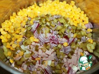 Лук мелко нашинковать, у меня для контраста сегодня красный лук. С кукурузы слить сок. Добавить в ёмкость к остальным продуктам. |
