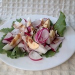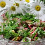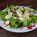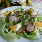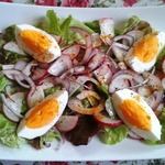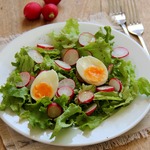 Листья салата порвать, лук нарезать перьями, редис полукольцами, яйцо дольками.