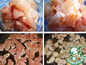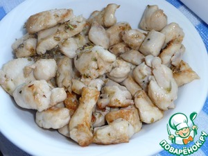 Курицу нарезать кубиками, посолить и приперчить. В большой сковороде разогреть масло топленое и обжарить курицу до легкой золотистой корочки около 4 минут. Добавить орегано, размарин. Старайтесь не пережарить, чтобы курица сохранила свою сочность.