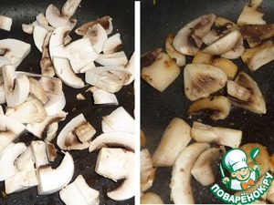 В сковороду добавить растительное масла и на среднем огне обжарить нарезанные грибы. Обжаривать, периодически помешивая, до золотистой корочки. Грибы не солить, они останутся сочными.