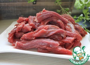 Мякоть говядины нарезать тонкими полосками