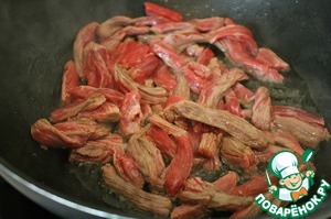 На сковороде раскалить масло и обжарить мясо, помешивая, до готовности