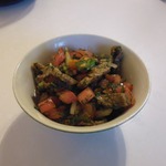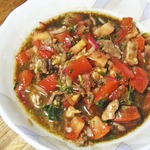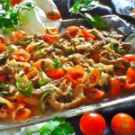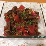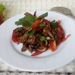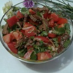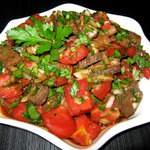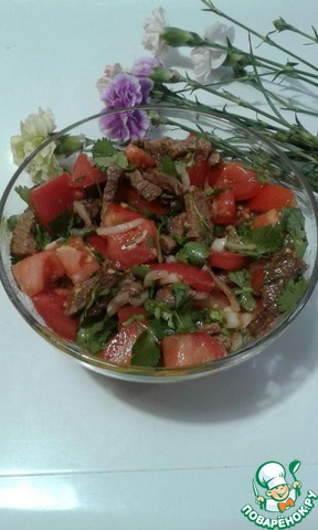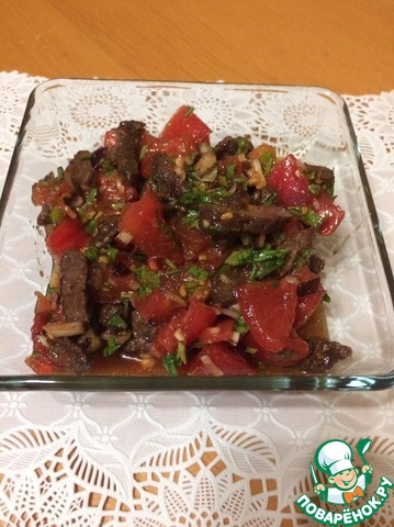 В ёмкости смешать помидоры, говядину, соль, соевый соус, перец жгучий, лук (нашинкованный мелко), чеснок (так же нарезанный мелко), молотую кинзу. Добавить масло, в котором жарилось мясо.