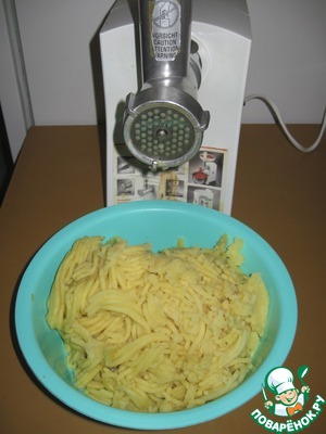 Картофель отварить в мундире и пропустить через мясорубку с мелкой сеткой.