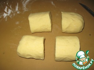 Раскатать каждую часть в "блин" толщиной примерно 5 мм. Сложить полученные "блинчики" стопкой, перемазывая растопленным сливочным маслом. Отправить в холодильник на 20 минут.
