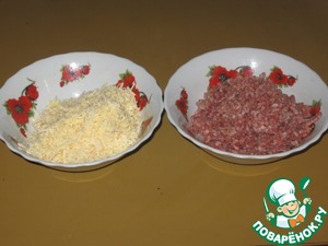 Купил недавно полпалки колбасы, а она не понравилась. Оставил, вот и пригодилась :) Перекрутить колбасу на мясорубку. Сыр натереть на терке.
