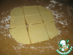 Раскатать стопку перемазанных "блинов" в пласт до толщины 5 мм (я делал это по частям), разрезать на квадратики.