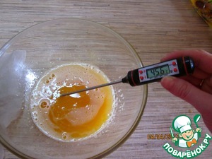 Яйца растираем с сахаром, ставим на водяную баню так, чтоб вода не касалась дна миски с яйцами. При постоянном помешивании прогреваем смесь до 45-50 градусов Цельсия. Снимаем с огня и взбиваем до бела.