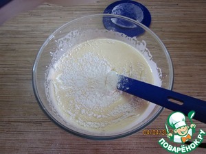 После того как вся мука добавлена, тонкой струйкой вливаем масло (на самом деле, можно делать и без масла. но с маслом корж корж получается более плотный.). Еще раз перемешиваем и выливаем в форму. Тесто должно быть достаточно жидкое. Как магазинная сметана 20% )))